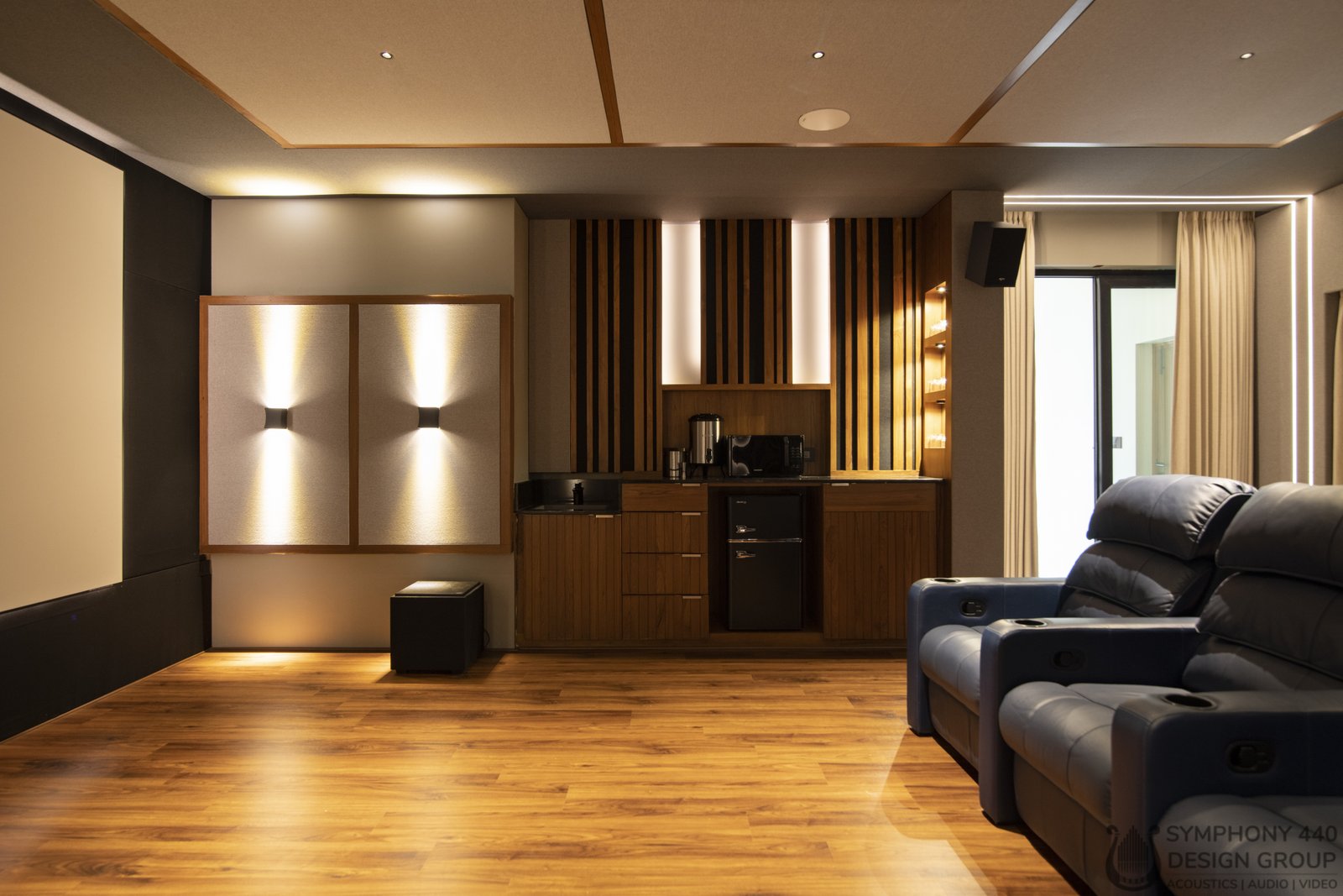 To create a fully custom home theater plus entertainment hub from the ground up, complete with a snack counter, fridge, microwave, and food storage space. From mixing wood and fabric to enhance aesthetics and optimize sound diffusion and scattering, to incorporating glass windows into the design and adding a touch panel to operate the AV system - this was a special project for our Home Theater Company.